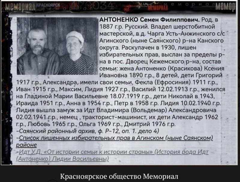 Одновременно были арестованы Осип Игнатьевич ПАНОВ (р. около 1895) и его отец Игнатий Фёдорович ПАНОВ (р. около 1875), сосланные в 1930 г. из дер. ПАНОВО, Аким Васильевич ЯДРИХИН (р. около 1897) и Калина АНТИПИН (р. около 1898).