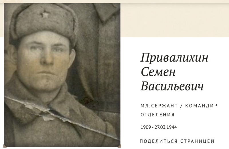 Привалихин Семен Васильевич, 1909г.р. Место рождения Красноярский край, Кежемский район, д.Соколово. До войны жил в Красноярском крае, ЭНО, Тунгусо-Чунский район, ф.Оскоба. Призван Тунгусо-Чунским РВК в 1941году. Мл.сержант. Командир отделения. В/ч 1319 сп 185 сд.,620 сп 164 сд. Награжден медалью За отвагу. Убит в бою 27.03.1944 года. Похоронен Беларусь, Витебская область, д.Шапуры, юго-западнее, 200 м. Жена Привалихина Вера Федоровна. Фотографии предоставлены Музеем п.Ванавара, Тунгусо-Чунский район, ЭНО, Красноярский край.