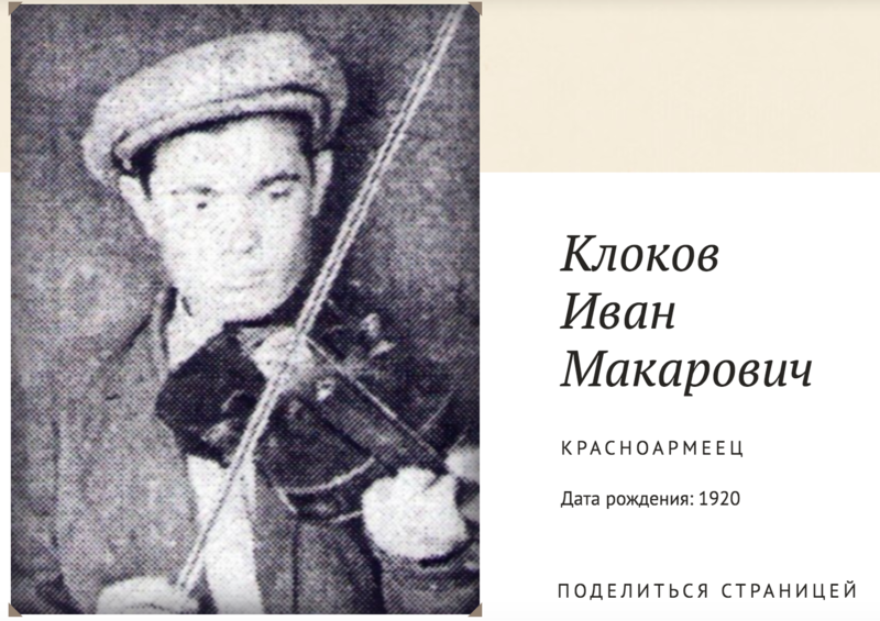 Клоков Иван Макарович,1920г.р. Место рождения Красноярский край, Кежемский район ,д.Паново, Призван Байкитским РВК в 1941году. Красноармеец. Документов о нем на сайте ОБД МЕМОРИАЛ нет. Фото предоставлено Байкитским филиалом МБУК Эвенкийский краеведческий музей ЭМР.