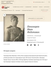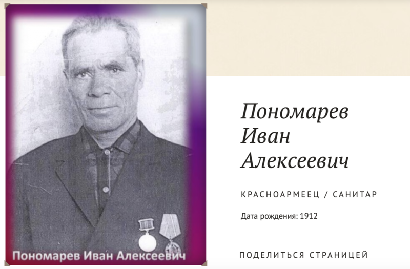 Пономарев Иван Алексеевич, 1912г.р. Место рождения Красноярский край, Кежемский район. До войны жил в Красноярском крае, ЭНО, Тунгусо-Чунский район, п.Ванавара. Призван Тунгусо-Чунским РВК в 1942году. Красноармеец. Санитар военного эшелона. Плен. Бежал из плена с третьей попытки. Служил в пехоте. Награжден юбилейным орденом Отечественной войны 2 степени. Вернулся с войны в Ванавару. Один из лучших кадровых охотников Эвенкии.