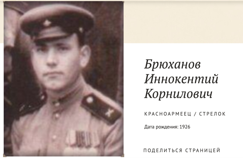 Брюханов Иннокентий Корнилович, 1926г.р. Место рождения Красноярский край, Кежемский район, д.Кежемская Заимка. До войны жил в Красноярском крае, ЭНО, Тунгусо-Чунский район, ф.Оскоба. Призван Тунгусо-Чунским РВК в 1944году. Красноармеец. Стрелок. В/ч 13 сп 2 сд.Награжден медалью За отвагу, юбилейным орденом Отечественной войны 2 степени. После войны вернулся в Оскобу,работал на звероферме.