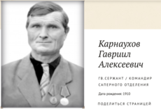 Карнаухов Гавриил Алексеевич, 1910г.р Место рождения Красноярский край, Кежемский район, д.Фролово. До войны жил в Красноярском крае, ЭНО, Тунгусо-Чунский район, п.Ванавара.Призван Тунгусо-Чунским РВК в 1942году. Гв.сержант. Командир саперного отделения. В/ч 10 гв.вдсп 3 гв.вдд., 327 гв.сп 128 гв.сд.Ранен в 1943 году,тяжело ранен в 1944 году,направлен в госпиталь г.Минеральные воды.Награжден орденом Красной Звезды. Жена Карнаухова Елена Николаевна.