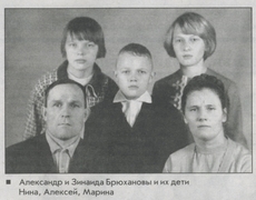 Зинаида Арсентьевна (в девичестве Казакова) родилась в 1933 году в деревне Мозговая. Была вторым ребёнком в семье, где выросло четверо детей. Её родители - Мария Григорьевна и Арсентий Михайлович Казаковы - трудились в колхозе «Культурная революция». Как и многие коренные ангарцы, супруги Брюхановы хорошо знают, кто из какого рода. Зинаида Арсентьевна, например, из рода Лавёровых. Вероятно, предок носил имя Лавр. И на типично ангарский вопрос «Вы чьих будете?», следовал ответ «Лавёровых». Но это мои предположения. Может, было совсем по-другому. Её муж, Александр Алексеевич Брюханов, - из рода Мишкиных. Он родился в Кежме в 1930 году. В семье его родителей - Алексея Ивановича и Федосьи Фёдоровны Брюхановых - росло восемь детей. Александр был седьмым по счёту. В1950 году Александра Брюханова призвали в армию. Прослужил связистом четыре с половиной года в авиационном полку в Иркутской области. Вернулся домой из армии в 1954 году, а 7 апреля 1955 года поехал сватать невесту. Через неделю после сватовства, 14 апреля, они уже расписались и с тех пор живут, по словам их дочери Нины, «ни на минуту не разлучаясь друг с другом».
