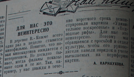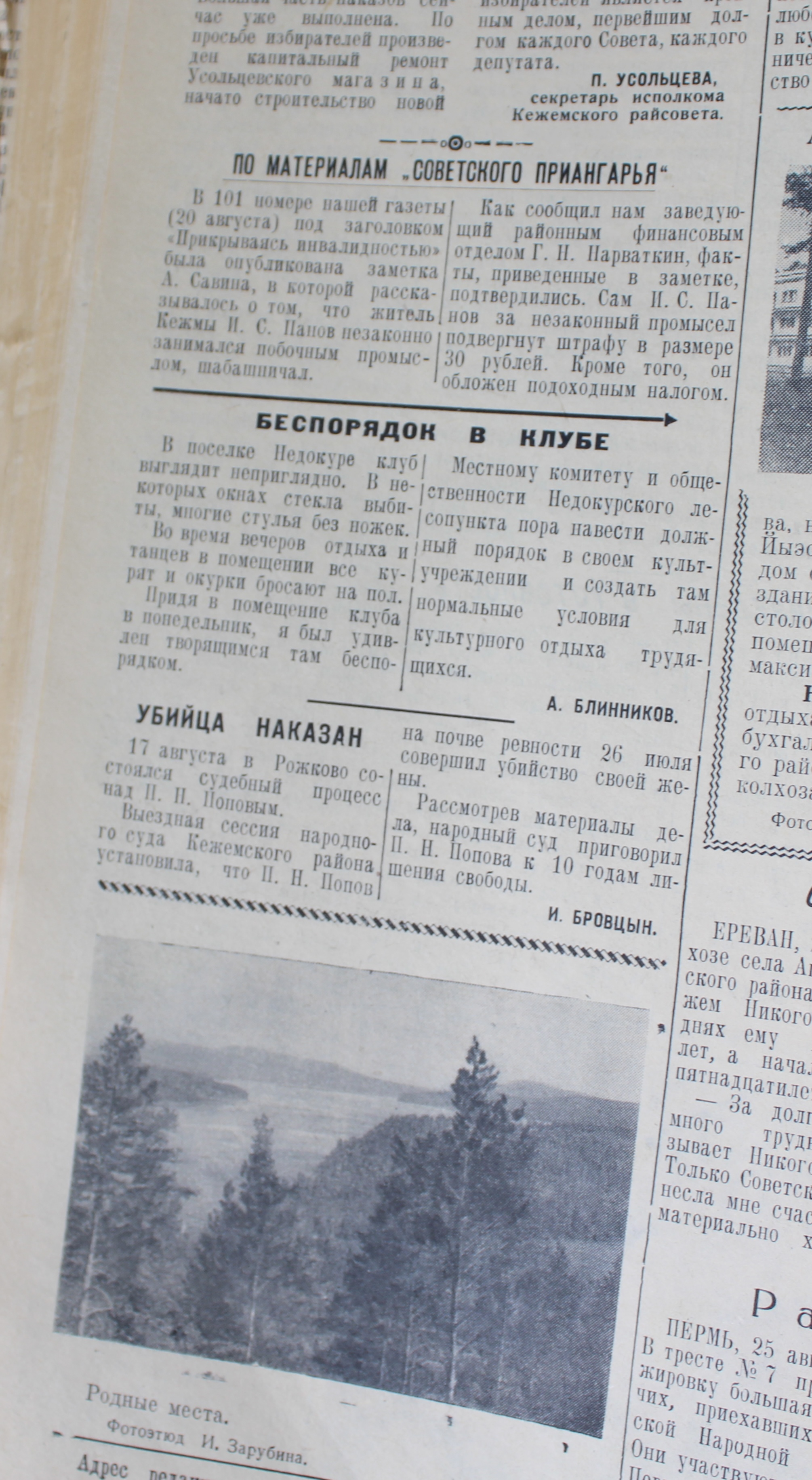 8 сентября. Для нас это неинтересно (повторное кино в Мозговой). Новые дома в Кежме. Вниманию зав районо. Случай на рыбалке.